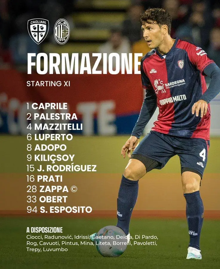 卡利亞里首發(fā):1-卡普里萊、4-馬齊泰利、6-盧佩爾托、15-胡安·羅德里格斯、28-扎帕、33-奧伯特、2-帕萊斯特拉、8-阿多博、16-普拉蒂、9-基里索、94-S-埃斯波西托